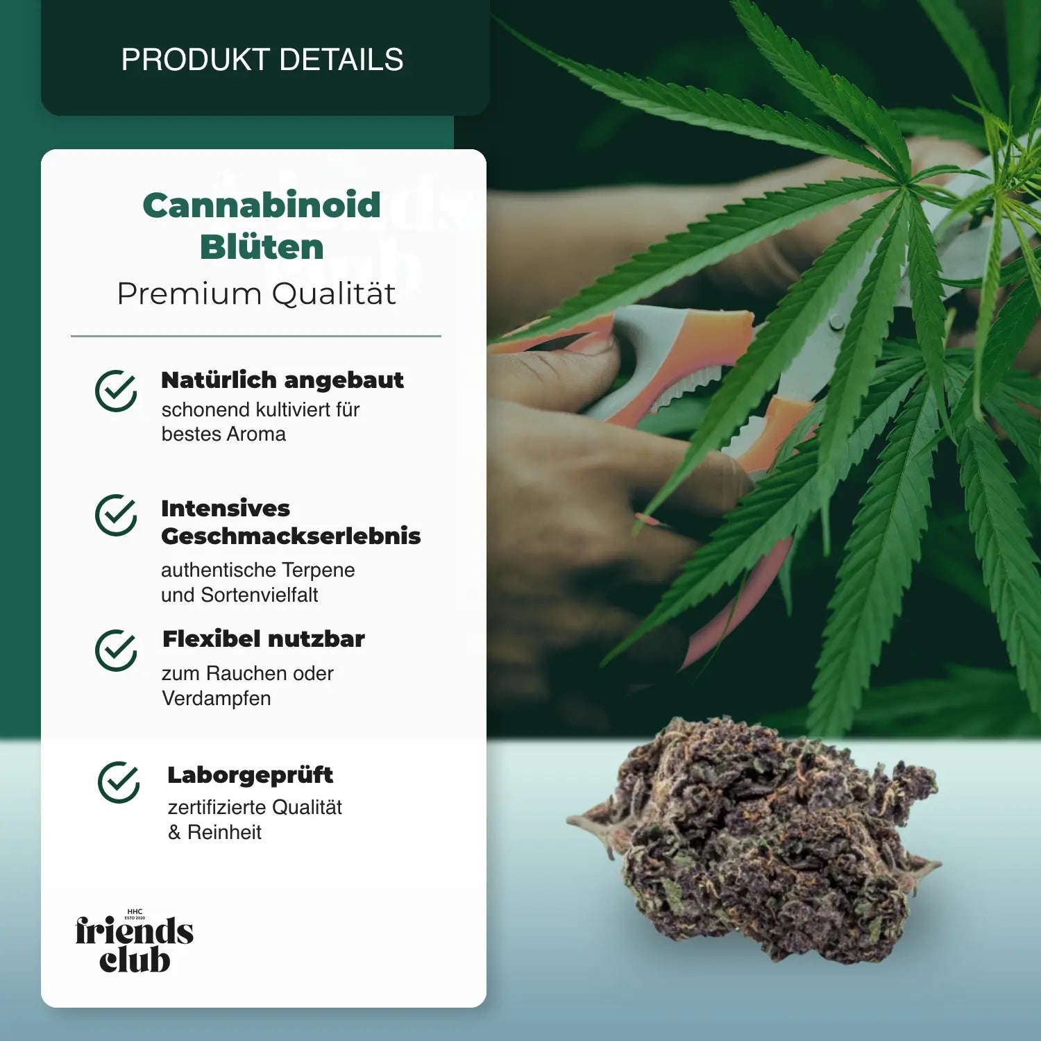 Erlebe die kraftvolle Wirkung unserer PHC Blüte Purple Haze mit einem beeindruckenden PHC-Gehalt von 25%. Die Sorte überzeugt durch ihr markantes Aroma und ihre intensive Qualität - ideal für Kenner und Liebhaber besonderer Blütenerlebnisse. Der THC-Gehalt liegt unter 0,2%, wodurch sie den gesetzlichen Vorgaben entspricht.