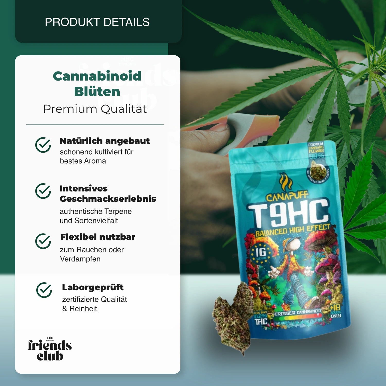 - Inhalt: T9HC Blüten (verschiedene Grammaturen je nach Auswahl)