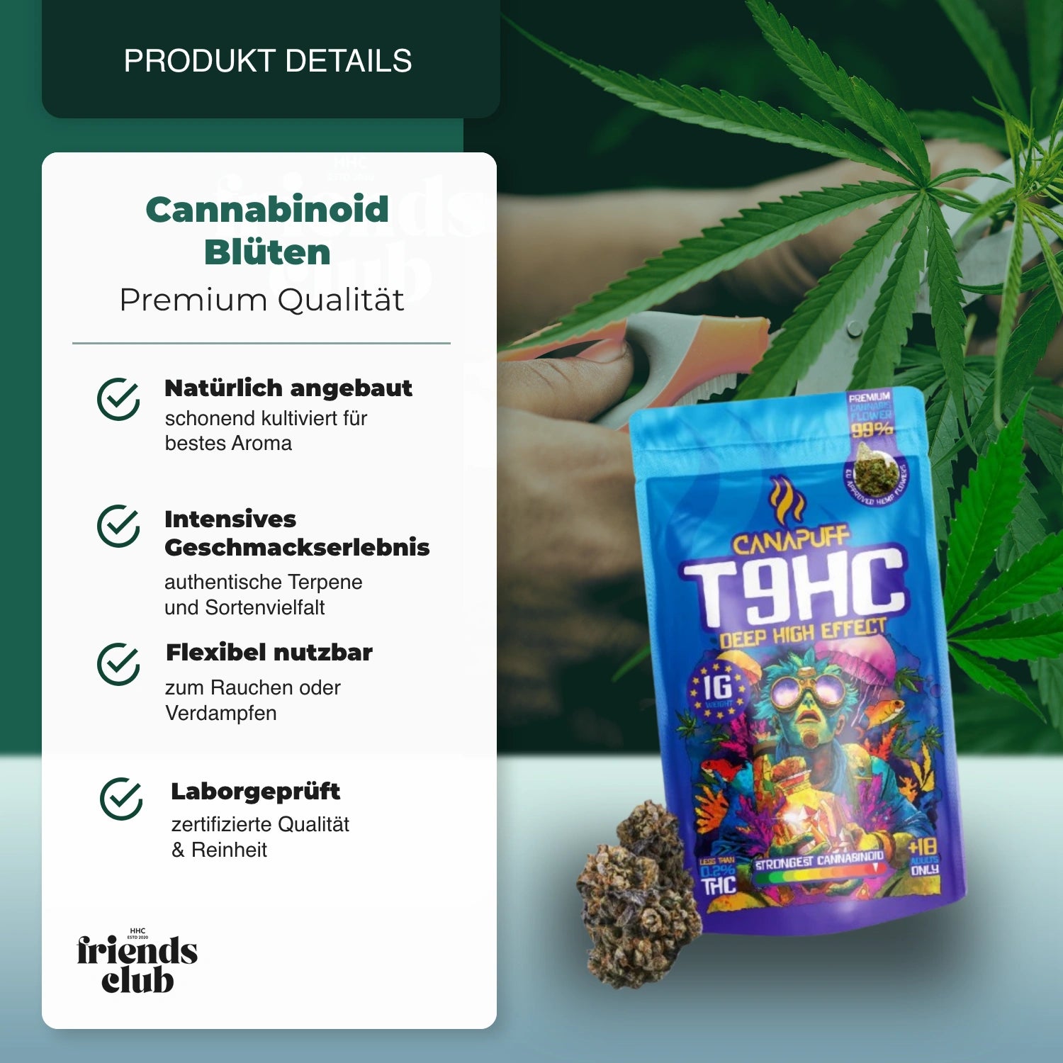 - Inhalt: T9HC Blüten (verschiedene Grammaturen je nach Auswahl)